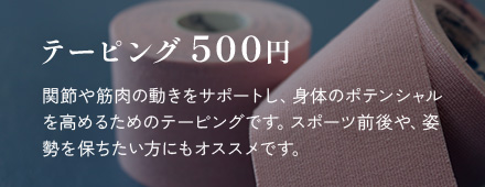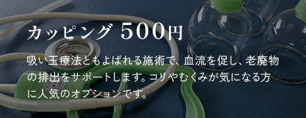 お客様の状態に応じて、各オプションとしてテーピング・カッピングの併用も可能です。
